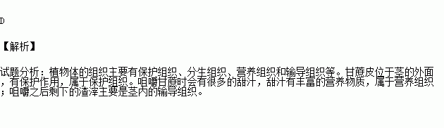 我们在吃甘蔗时,首先要把甘蔗坚韧的皮剥去;咀嚼甘蔗时会有很多的甜汁。那些咀嚼之后剩下的渣滓吐掉。试从组织构成器官的角度,分析甘蔗茎由哪些组织构成( )