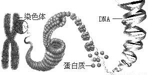 解答:解:染色体是细胞核中容易被碱性染料染成深色的物质,染色体是由DNA和蛋白质两种物质组成;DNA是遗传信息的载体,主要存在于细胞核中,DNA分子为双螺旋结构,像螺旋形的梯子;DNA上决定生物性状的小单位,叫基因.基因决定生物的性状.一条染色体有一个DNA分子组成,一个DNA分子上有许多个基因.因此染色体主要由脱氧核糖核酸(DNA)和蛋白质组成,如图