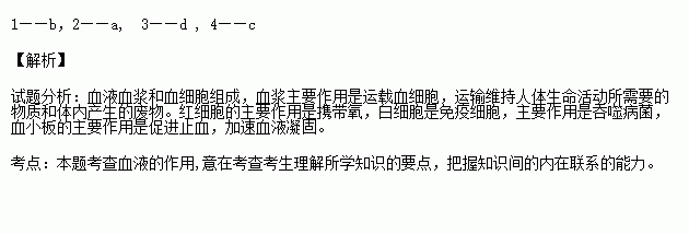 请将以下血液中的成分与它们具有的功能用线连起来。