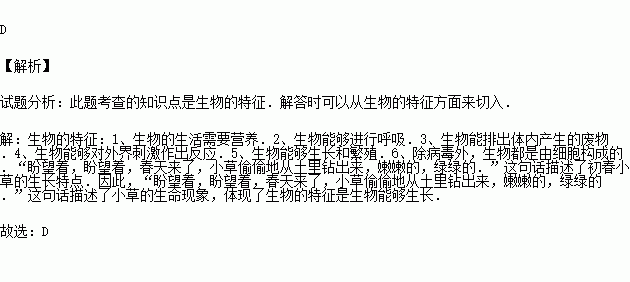 “盼望着,盼望着,春天来了,小草偷偷地从土里钻出来,嫩嫩的,绿绿的.”这句话描述了小草的生命现象,体现了生物的哪种特征( )