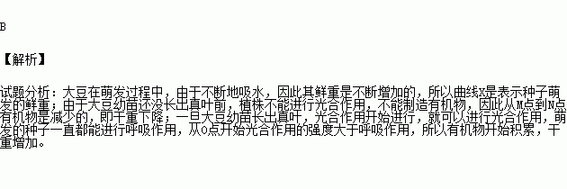 下图是大豆种子在萌发成幼苗的过程中,根据其干重和鲜重的变化曲线,表示鲜重的是哪一条曲线?其光合作用开始于哪一点?