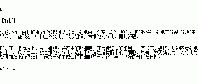 A.分裂 B.分化 C.生长 D.癌变