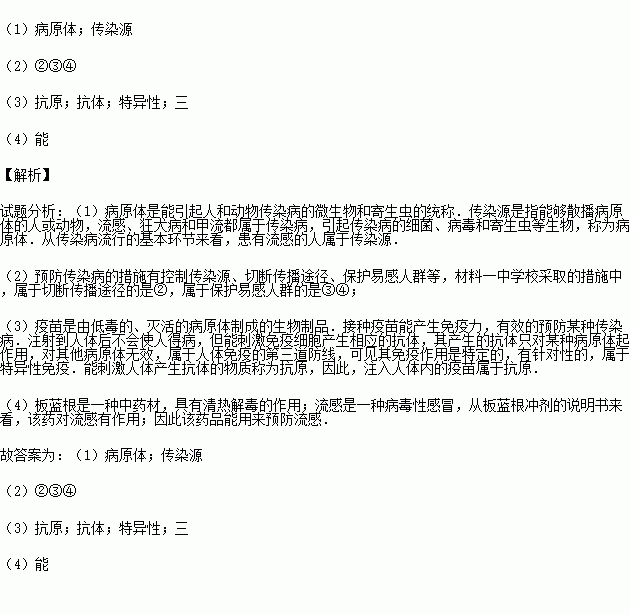 (4)一些同学自己购买了一些板蓝根冲剂,打开说明书一看,〔功能主治〕:清热解毒.用于病毒性感冒,咽喉肿痛.这种药品能否用来预防流感? .