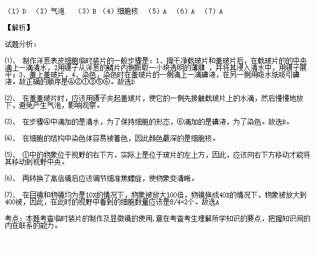 下图显示制作洋葱鳞片叶内表皮细胞临时装片的几个步骤。请根据制作临时装片的知识回答问题: