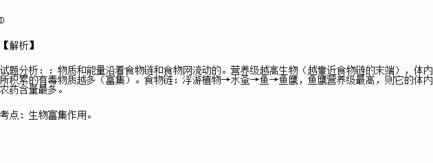 一个池塘被农药污染,在池塘中有一个食物链:浮游植物→水蚤→鱼→鱼鹰,则体内农药含量最多的生物是( )