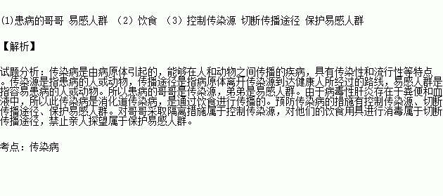 (3)从预防传染病的一般措施来看,对哥哥采取隔离措施属于 ,对他们的饮食用具进行消毒属于 ,禁止亲人探望属于 。