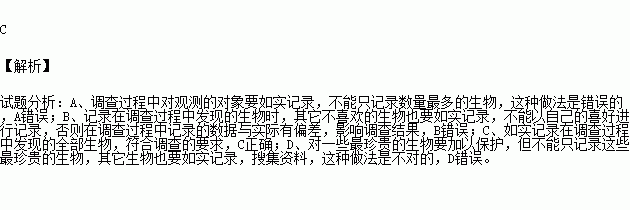 在调查校园的生物种类时,要仔细观察、认真记录,正确的做法是( )