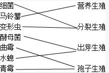 解答:解:细菌属于分裂生殖,属于无性生殖;马铃薯利用芽进行繁殖,是利用块茎进行繁殖,马铃薯的繁殖方式是营养繁殖;变形虫属于单细胞动物,繁殖方式是分裂生殖;酵母菌属于单细胞真菌是出芽生殖;曲霉属于多细胞真菌,能产生孢子,用孢子繁殖后代;水螅是出芽生殖;青霉属于多细胞真菌,能产生孢子,用孢子繁殖后代.