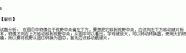 下图是用显微镜观察一个写有“d”字母玻片的两个视野,要将视野从图①转换为图②,首先应该( )