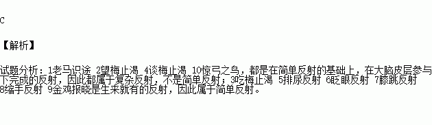 1老马识途 2望梅止渴 3吃梅止渴 4谈梅止渴 5排尿反射 6眨眼反射 7膝跳反射 8缩手反射 9金鸡报晓 10惊弓之鸟