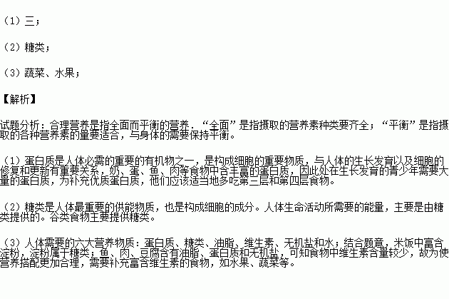 (1)正在生长发育的青少年需要较多的蛋白质,应该多吃第 层和第四层的食物。