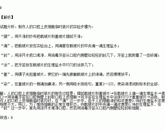 制作人的口腔上皮细胞临时玻片标本时,刮取细胞的部位和在载玻片上滴加的液体分别是( )