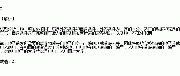 将颗粒完整饱满的种子分成甲、乙两组,在相同的适宜温度下播种,甲组种在肥沃湿润的土壤中,乙组种在贫瘠湿润的土壤中,这两组种子的发芽状况是( )