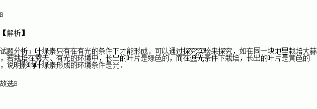 (2015•保亭县模拟)在同一块地里同时栽培大蒜,若栽培在露天环境中,长出的叶片是绿色的;而在遮光条件下栽培,长出的叶片是黄色的.该探究实验说明影响叶绿素形成的环境因素是( )