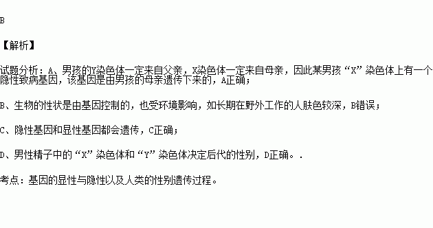 A.某男孩“X”染色体上有一个隐性致病基因,该基因是由男孩的母亲遗传下来的