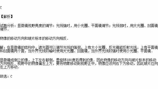 若显微镜下观察到的物像较暗且偏左上方,则以下操作中能使物像明亮并位于视野中央的是( )