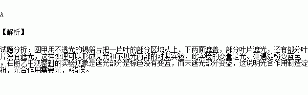 将某植物放置在黑暗处一昼夜后,选取一叶片按图甲处理,照光几小时后,摘下叶片,去掉锡箔,经脱色、漂洗再碘液处理,结果如图乙所示.下列分析中错误的是( )