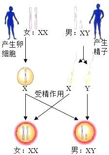 (3)女性的性染色体为X和X,男性的性染色体为X和Y。女性产生的卵细胞仅含X,男性产生的精子含X或Y基因,当卵细胞X与精子Y结合的受精卵为XY时,受精卵发育为男孩;当卵细胞X与精子X结合的受精卵为XX时,该受精卵发育为女孩。如图所示:
