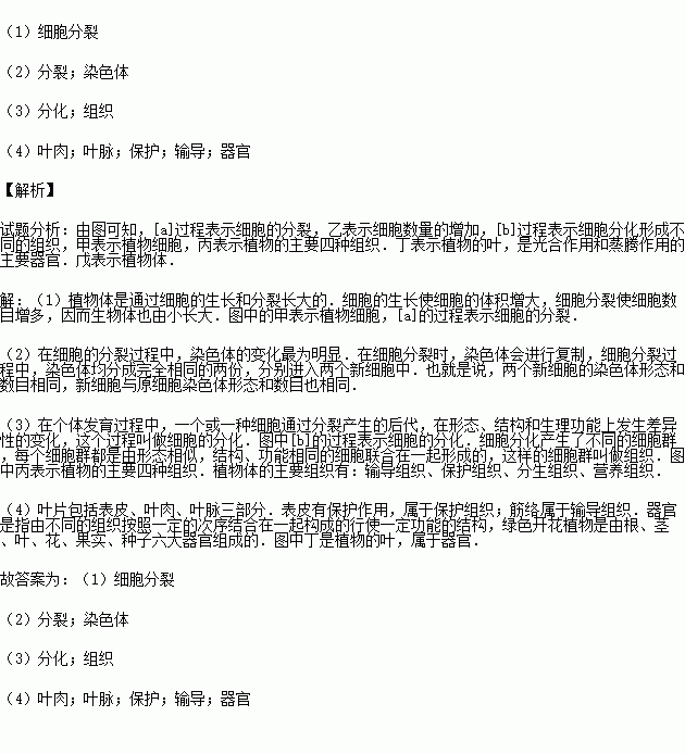 (4)图丁所示的植物叶由表皮、 和 三部分构成,叶的表皮属于 组织,其中的“筋络”属于 组织,所以叶在结构层次上属于 .