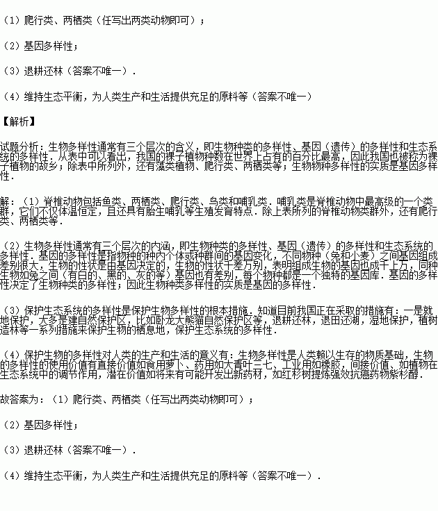 (4)保护生物多样性对人类的生产和生活有何意义?(任写两条)答: .