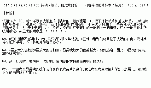 (5分)郝研同学使用显微镜观察洋葱鳞片叶内表皮细胞时,通过显微镜看到了以下几幅图像,请分析回答有关问题: