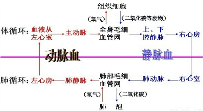 解:体循环是指血液由左心室进入主动脉,再流经全身的各级动脉、毛细血管网、各级静脉,最后汇集到上下腔静脉,流回到右心房的循环,在体循环中,从左心室射出的动脉血流经身体个部分的组织细胞周围的毛细血管时,与组织细胞进行物质交换:将运来的营养物质和氧气供给细胞利用,将细胞产生的二氧化碳等废物带走;这样,血液经过体循环,就由动脉血变成了静脉血;肺循环是指血液由右心室流入肺动脉,流经肺部的毛细血管网,再由肺静脉流回左心房的循环;在肺循环中,从右心室射入肺动脉的静脉血,流经肺部毛细血管时,血液中的二氧化碳进入肺泡,肺泡中的氧气进入血液,这样,经过肺循环,血液由静脉血变成了动脉血.如图所示:即在血液循环的过程中,肺动脉里的血液中含氧量最低.
