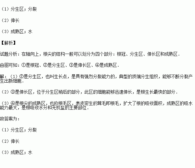 (3)④是根尖的 ,是根吸收 和无机盐的主要部位.