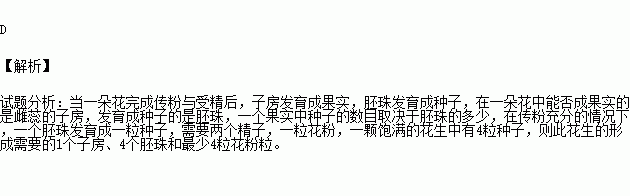一颗饱满的花生中有4粒种子,则此花生的形成需要的子房、胚珠、和精子的数量分别应是( )
