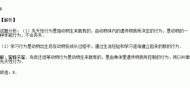 (2015秋•丰润区期末)蜜蜂采蜜、鸟类迁徙等动物行为是动物生来就有的,是由身体里遗传物质所控制的行为,所以叫做( )