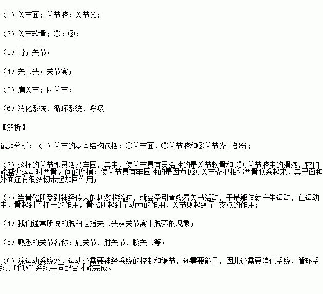 (2)这样的关节即灵活又牢固.其中,使关节具有灵活性的是 和[ ]中的滑液,它们能减少运动时两骨之间的摩擦;使关节具有牢固性的是因为[ ]把相邻两骨联系起来,其里面和外面还有很多韧带起加固作用.