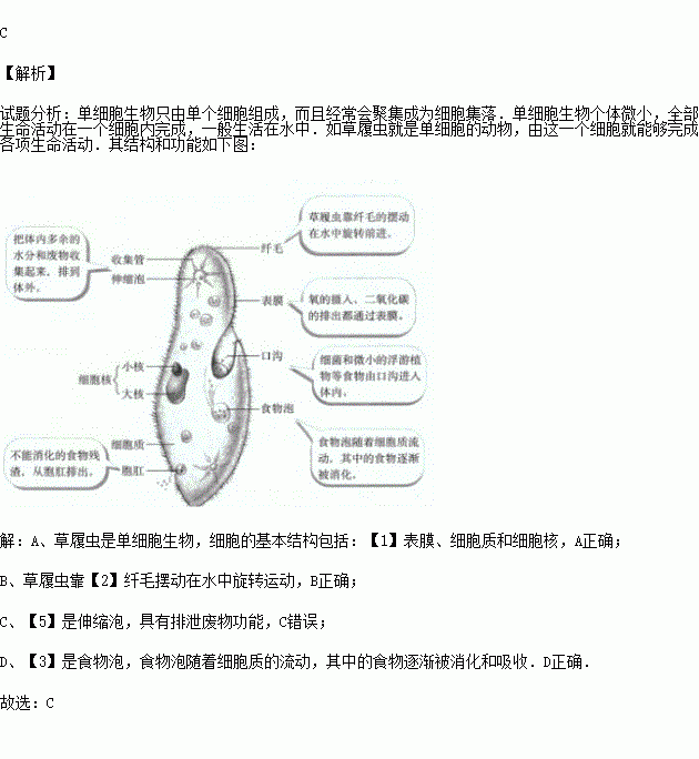 B.草履虫靠【2】纤毛摆动在水中旋转运动