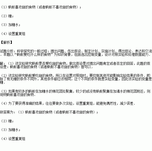 (3)如果有较多的蚂蚁在 的棉花团处聚集,则说明蚂蚁喜欢甜的食物.