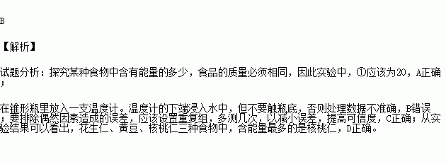 D.从实验结果可看出,花生仁、黄豆、核桃仁三种食物中,含能量最多的是核桃仁