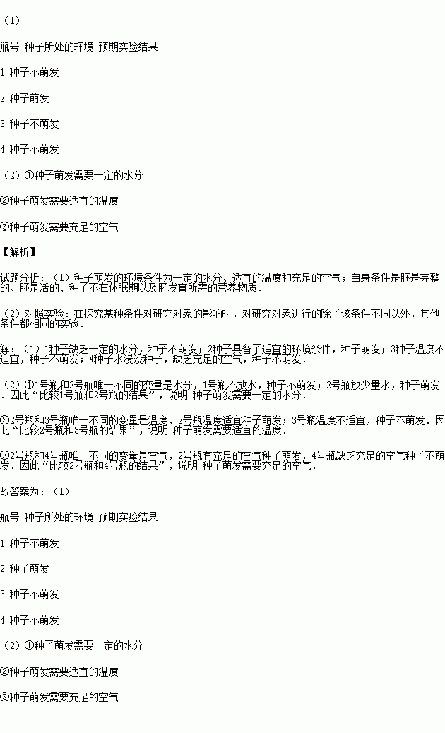 £¨1£©Èô×÷³öµÄ¼ÙÉèÊÇ£ºÖÖ×ÓµÄÃÈ·¢ÐèÒªÒ»¶¨µÄË®·Ö¡¢ÊÊÒ˵ÄζȺͳä×ãµÄ¿ÕÆø£®Çë¸ù¾Ý¼ÙÉèÔÚÈç±íÄÚÌî³ö¸÷×éʵÑéµÄÔ¤ÆÚ½á¹û