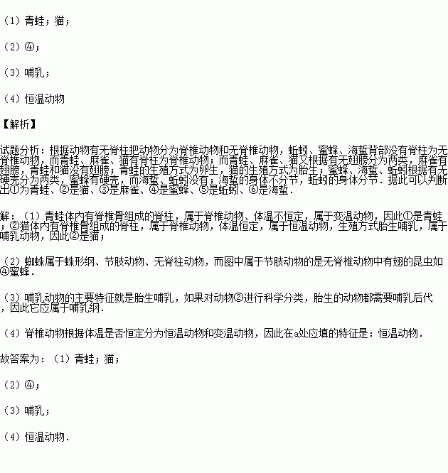 (2)蜘蛛与上述六种动物中的 动物具有最多的相同特征(填序号).