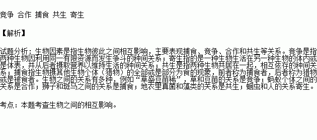(5分)生物之间的关系有多种,例如“草盛豆苗稀”,草和豆苗的关系是____________;蚂蚁个体之间的关系是___________;狮子和斑马之间的关系是__________;地衣里真菌和藻类的关系是___________;蛔虫和人的关系_____________。