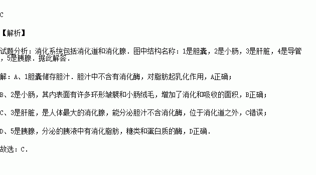 C.3是肝脏,是人体最大的消化腺,能分泌含多种消化酶的胆汁