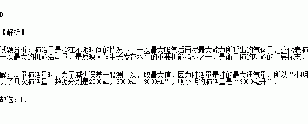 (2015秋•靖江市期末)某学校医务室组织学生检查身体,小明测了几次肺活量,数据分别是2500mL,2900mL,3000mL,小明的肺活量是( )