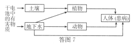 (1) 图4-7-2-3表示的是干电池丟弃污染环境后,重 金属迁移富集,进入人体的过程。请在下列方框中 填上对应的词:土壤、地下水、植物、动物。