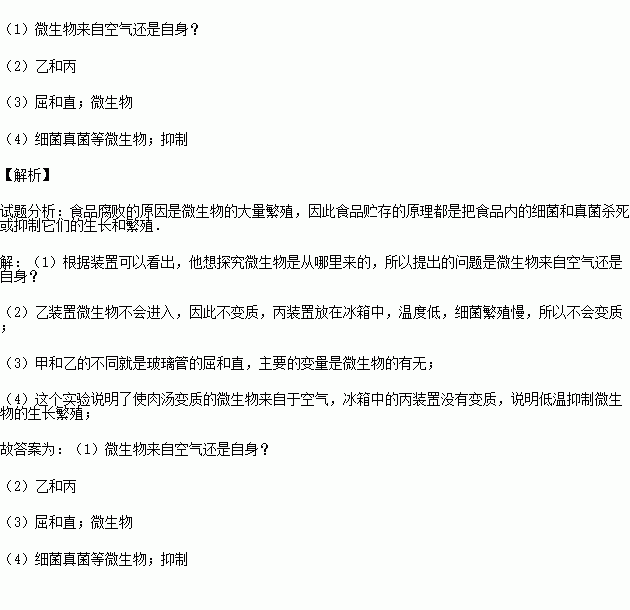 (4)这个实验说明了肉汤变质的原因是 进入肉汤并生长繁殖.同时还可以说明低温能够 微生物的生长繁殖.