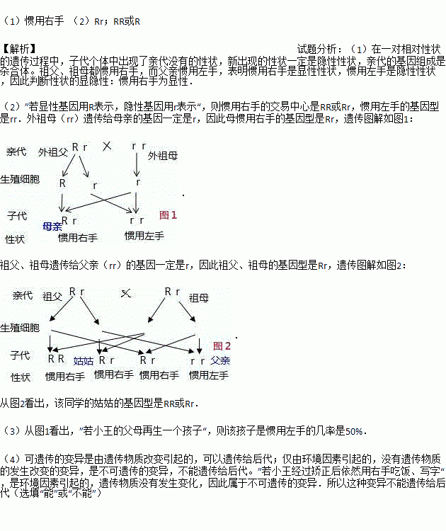 (4)若小王经过矫正后依然用右手吃饭、写字,那么这种变异可以遗传给后代吗?
