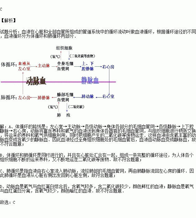 A.血液经过全身组织细胞处的毛细血管后,血液由动脉血变成静脉血