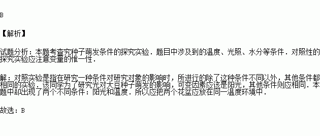 £¨2012•¿ªÔ¶ÊУ©Ä³Í¬Ñ§ÎªÌ½¾¿¡°Ñô¹â¶Ô´ó¶¹·¢Ñ¿µÄÓ°Ï족£¬Éè¼ÆÈçÏÂʵÑ飺ȡÁ½¸öÏàͬµÄ¡¢×°ÓÐͬÖÖµÈÁ¿»¨Ô°ÍÁµÄ»¨Åè·Ö±ð±êºÅΪ¢ÙºÍ¢Ú£¬ÔÚÁ½¸ö»¨ÅèÖв¥ÖÖÊýÁ¿ÏàµÈ¡¢±¥Âú³Ì¶ÈºÍ´óСÏàËÆµÄ´ó¶¹ÖÖ×Ó£¬²¢¶ÔÑô¹â¡¢Î¶ȡ¢Ë®¼ÓÒÔ¿ØÖÆ£¨ÈçϱíËùʾ£©£®ÁíһͬѧÔĶÁÁËÆäÉè¼Æ·½°¸ºó£¬Ìá³öÏÂÁÐÒâ¼û£¬ÆäÖÐÕýÈ·µÄÊÇ£¨ £©