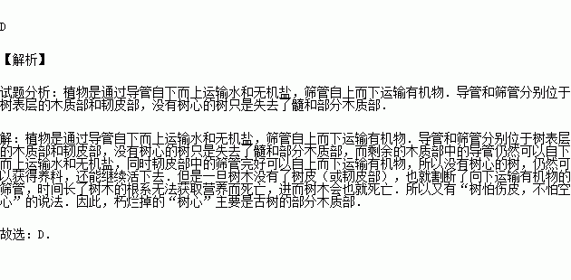 有些古树由于年代久远,树心已经朽烂,成为空心树,但这些树依然枝繁叶茂,由此推断,朽烂掉的部分是( )
