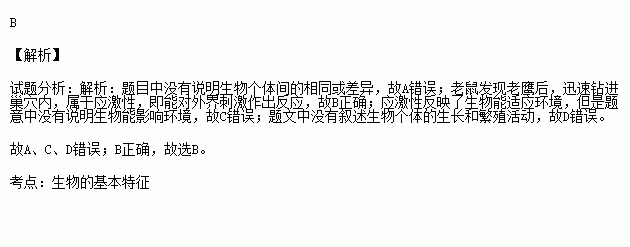 草原上,一只老鼠发觉老鹰在上空盘旋,便紧张而迅速地钻进附近的巢穴内.老鼠的这种行为体现了生物( )