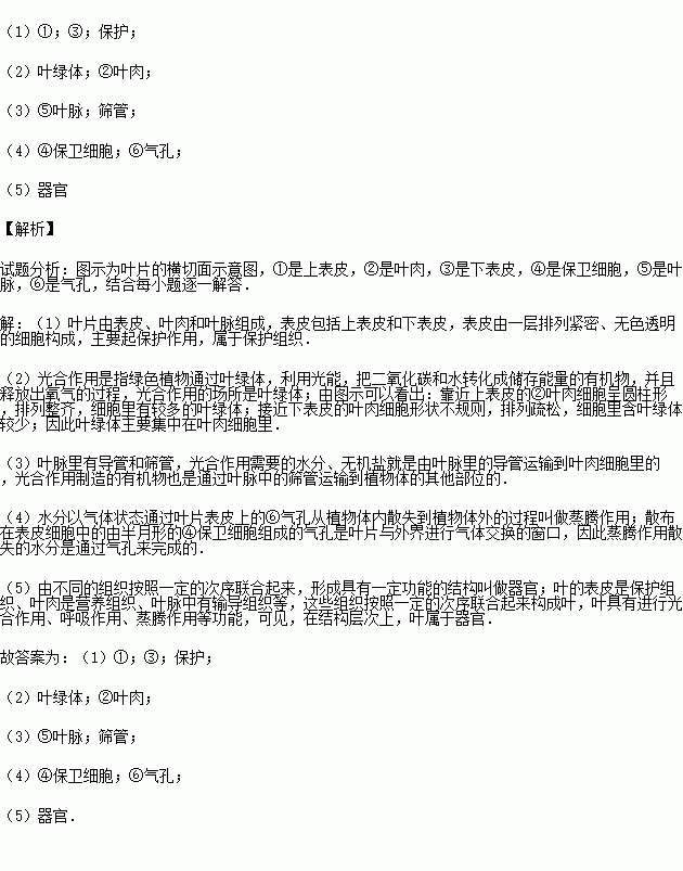 (5)根据叶片的结构和功能特点,可以判定叶所属的结构层次是 .