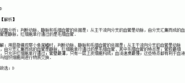 在显微镜下,观察小鱼尾鳍毛细血管的方法是要找到( )