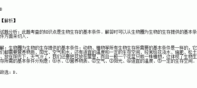 我们在养花的过程中,经常给花浇水、施肥、松土、放在阳光下,天气冷了,我们还要把花放在屋里,而且一般一个花盆只栽一株植物,这体现了生物生存所需的基本条件,与上述顺序相对应,分别是( )