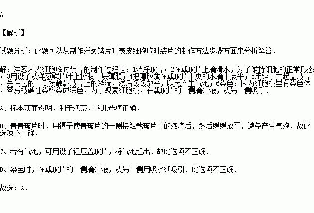 在制作洋葱表皮细胞临时装片时,正确的做法是( )