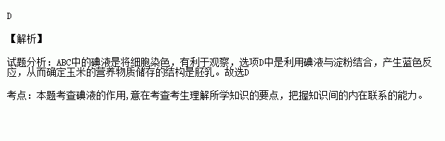 下列四个实验中都用到碘液,使用目的与其它三个实验不同的是( )